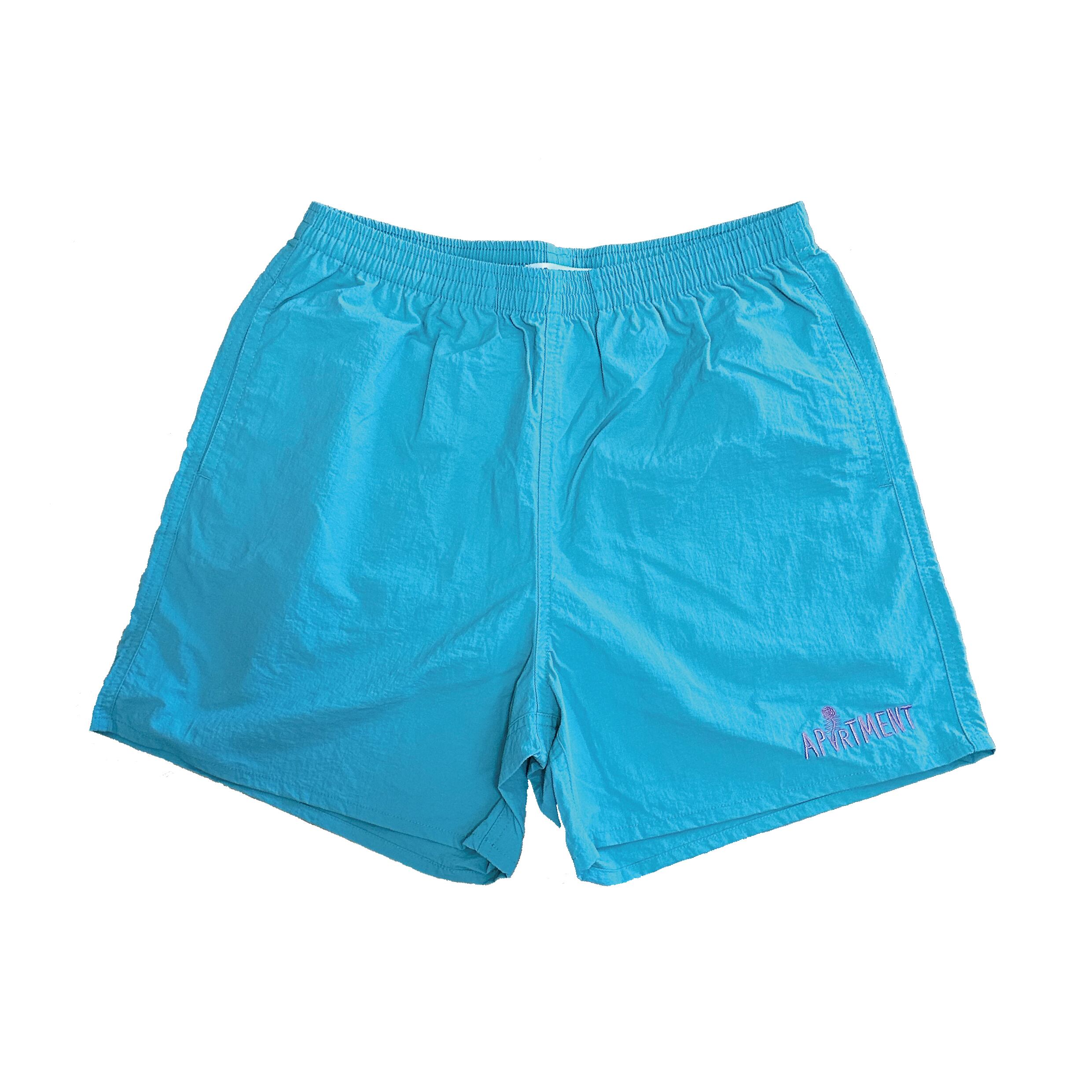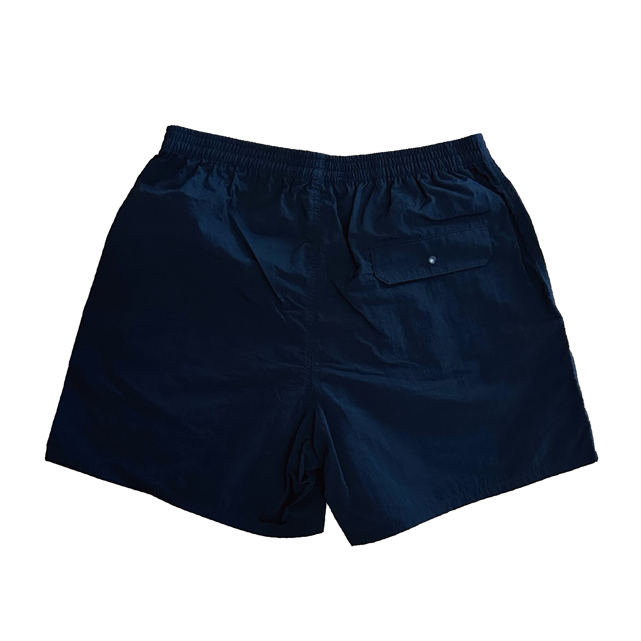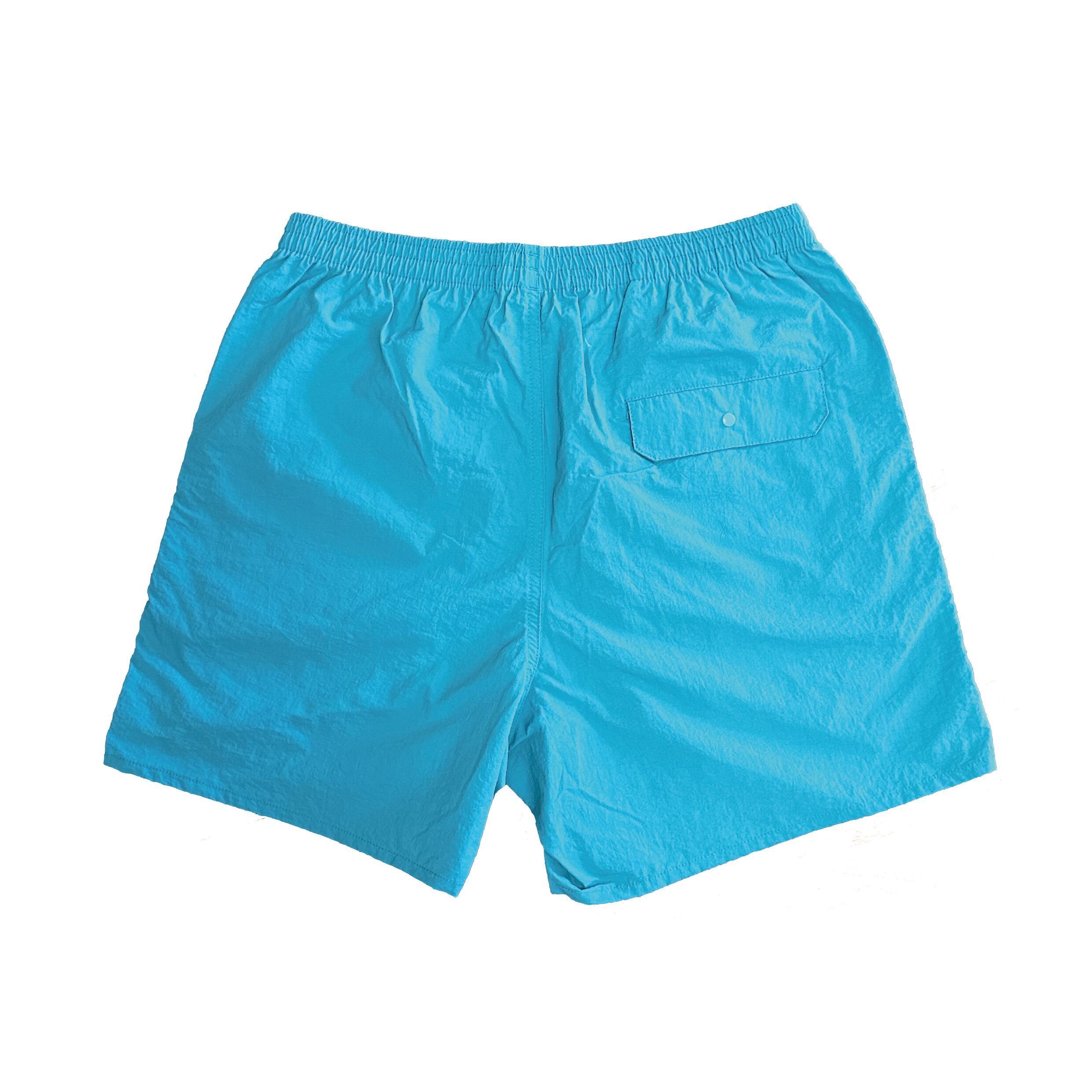 街穿きや水辺での使用も可能な、多目的ナイロンショーツにロゴの刺繍を施しました。